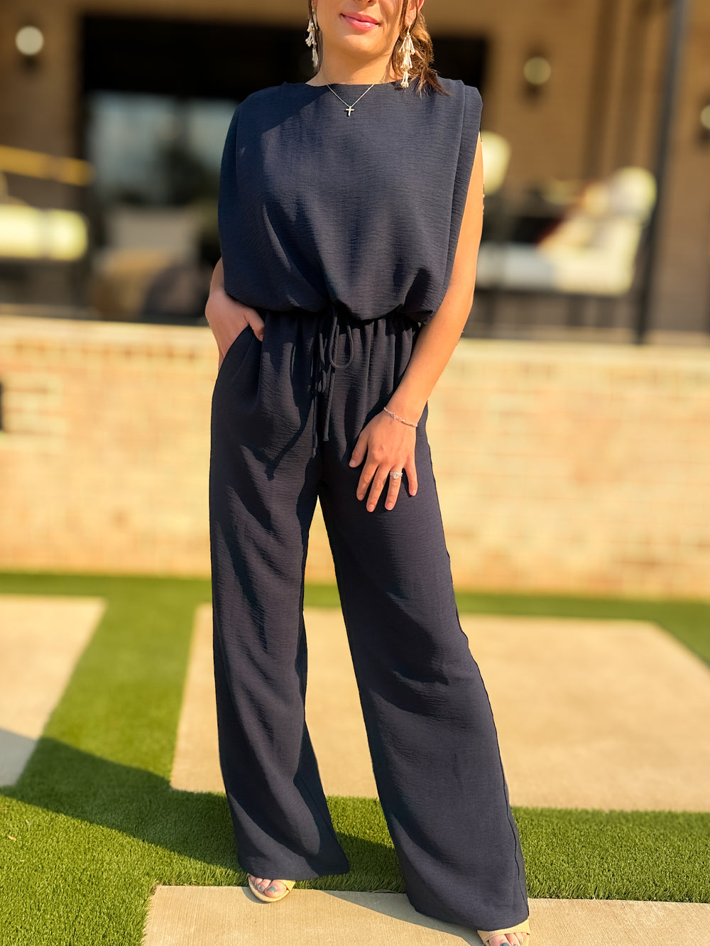 Back again for this season! One of our most popular pants in navy blue. These straight leg; drawstring pants are the perfect combination of dressed up casual. They have a matching top (sold separately.) Pair them together or with another one of your favorite tops.