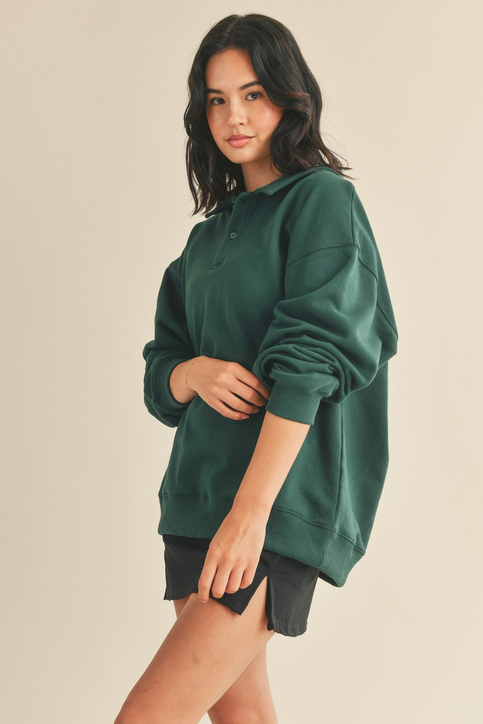 When you want something that is cozy and comfy this sweatshirt fits the bill. Featuring a collar and a two button neckline, this sweatshirt has some length to it for those days you need some extra cover.