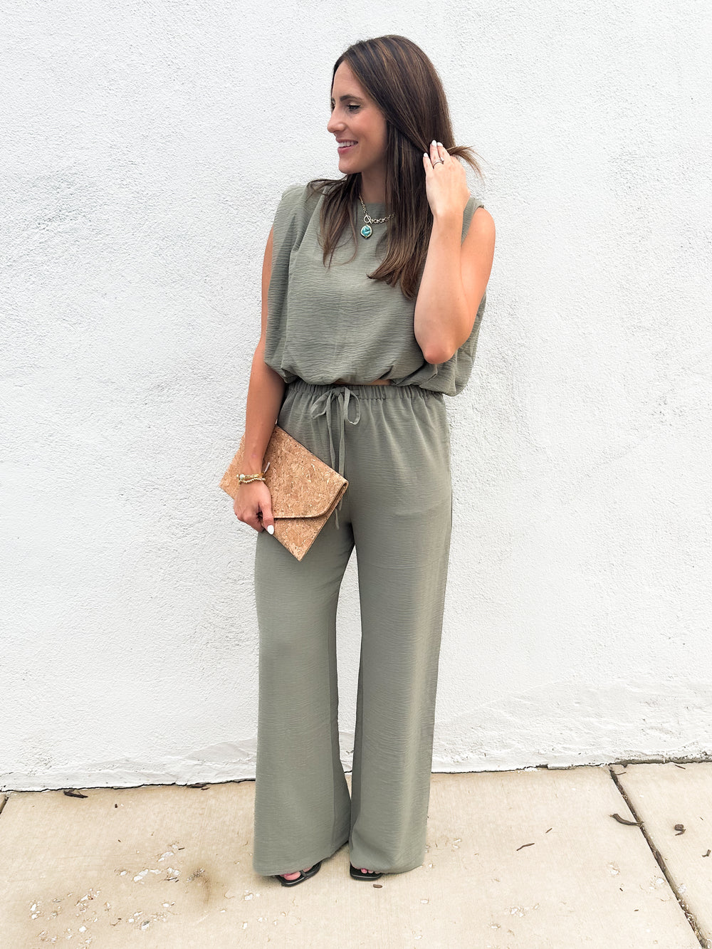 When you need style and comfort, these are the pants you want. A loose fit, drawstring waistband, and pockets. These pants have a matching top (sold separately.) They also look great with a simple body suit for a sleeker look.