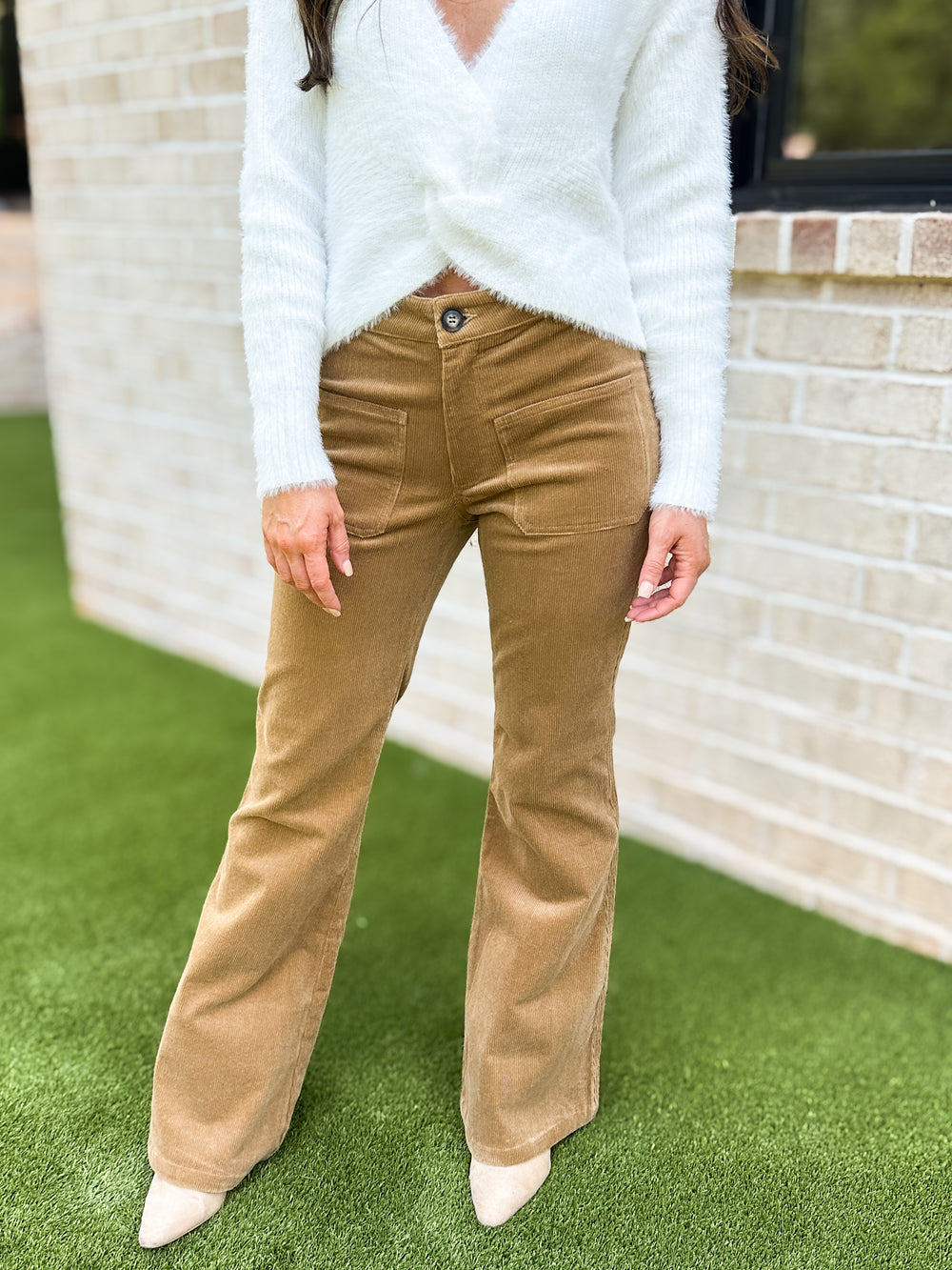 Giving 70s vibes! These flared corduroy pants have two front patch pockets. There is a slight stretch to the fabric which make them a comfortable fit.