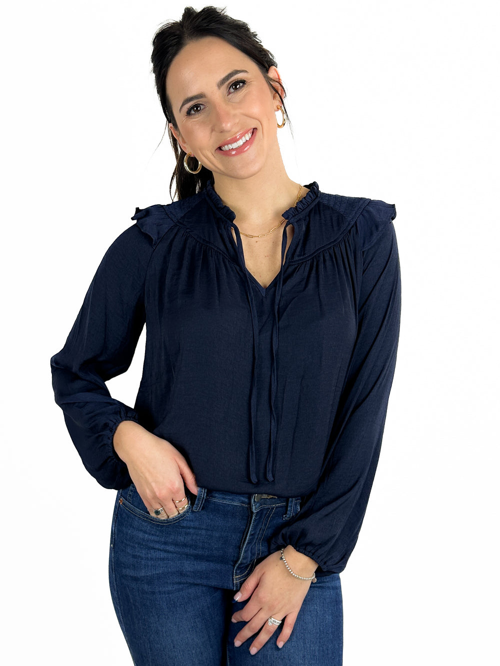 What makes a blouse special? Sometimes it’s the body style and sometimes it’s the fabric. This one has both. In a super soft, classic navy blue fabric, this blouse has a V-neck with a slight ruffle around the neck and shoulder. Wear it open or tied.