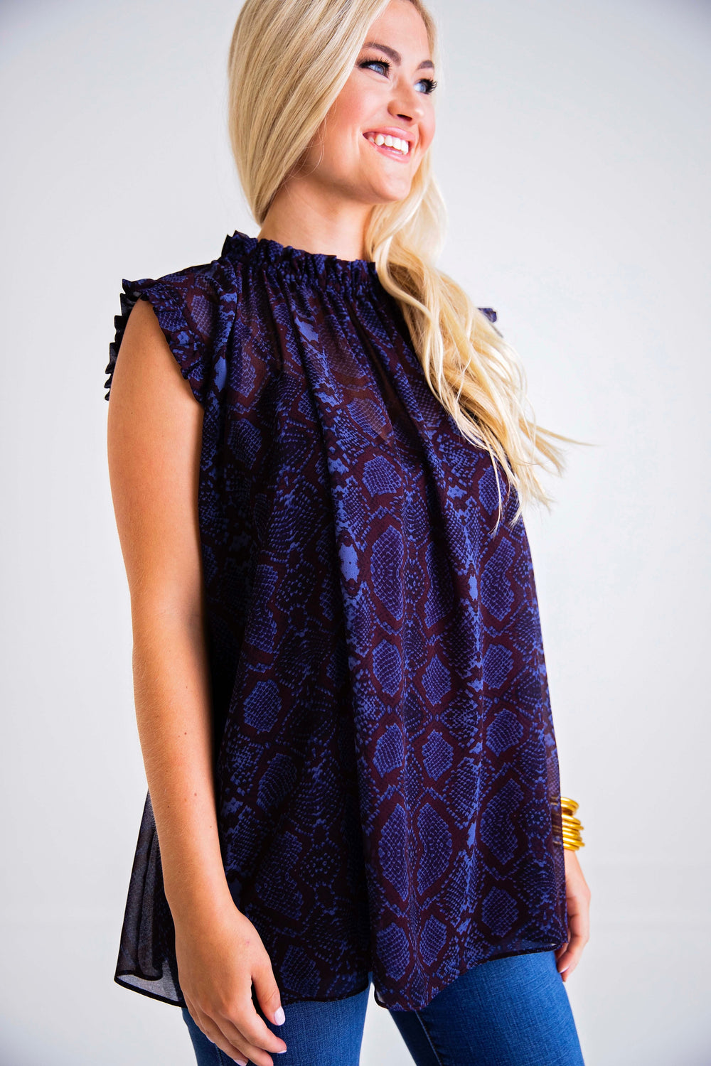 This is a great piece to add to your wardrobe. This top features a ruffle short sleeve, chiffon fabric in a two tone snake skin print, and a detachable cami. Model is wearing a small.