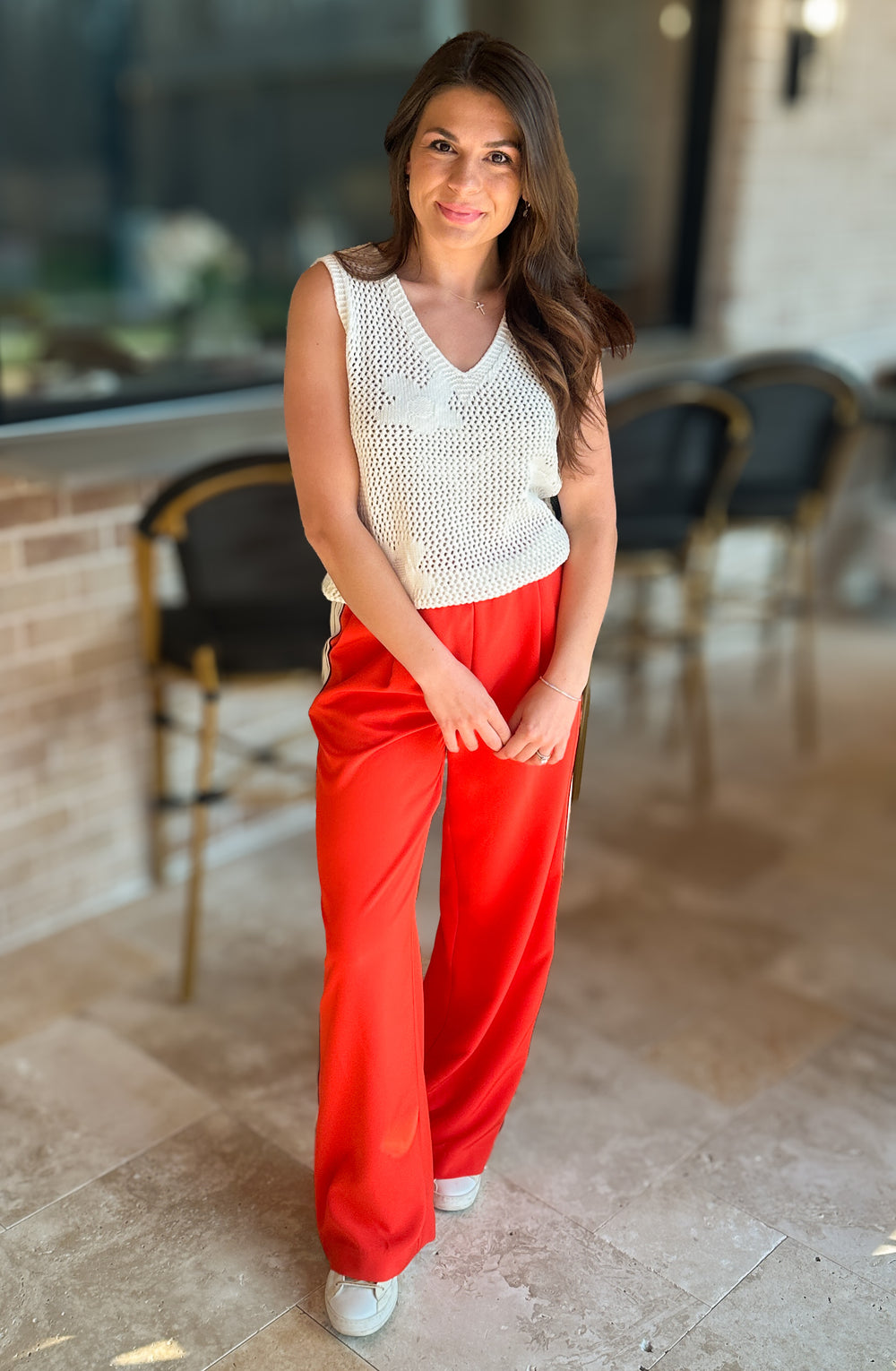 Simple, sleeveless, crocheted sweater vest. Done in a neutral knit, this top has a random flower pattern. A great basic piece.