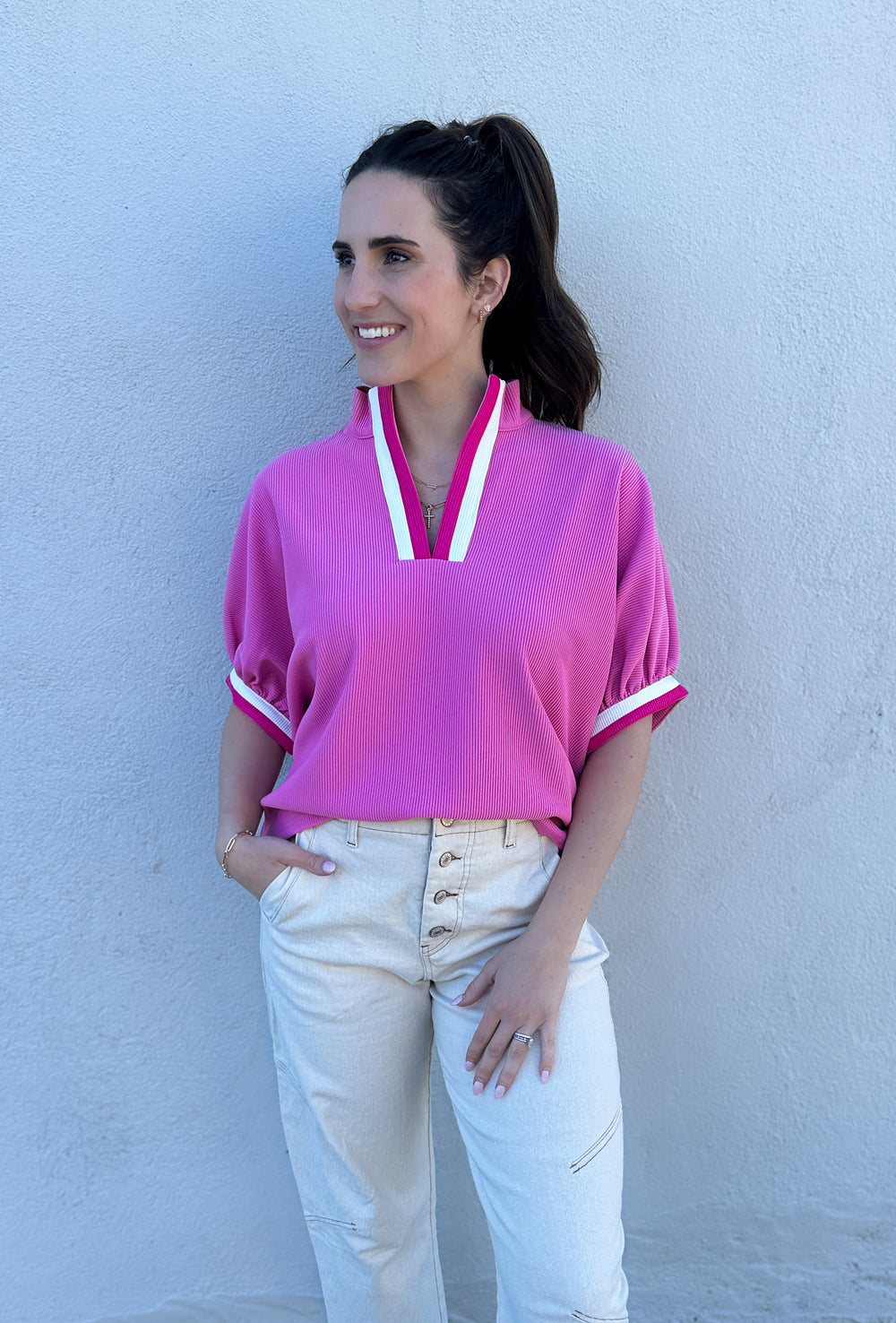 Are you a sporty dresser? We have the top for you. It's definitely giving sporty girl vibes...think old school tennis. V-neck and short sleeve trimmed in contrasting colors. This top is done in a ribbed fabric and has a drop shoulder for an easy fit.