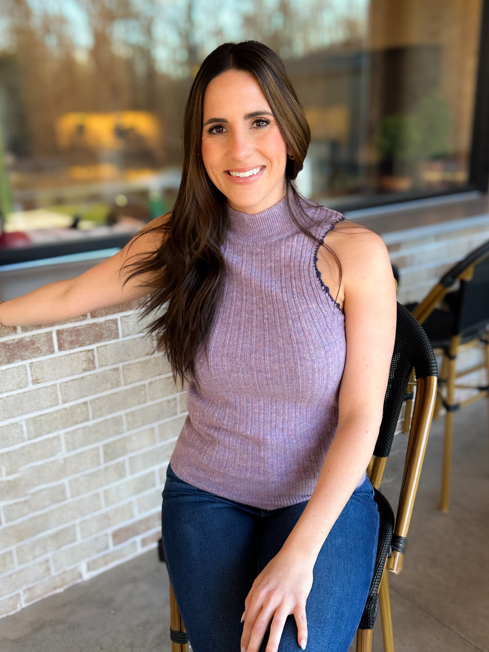 Great mock nock sleeveless sweater. Made of a grape heathered knit with whipstitching around the neck and arms, this sweater is great to wear in mild temperatures or as a layering piece for cooler days.