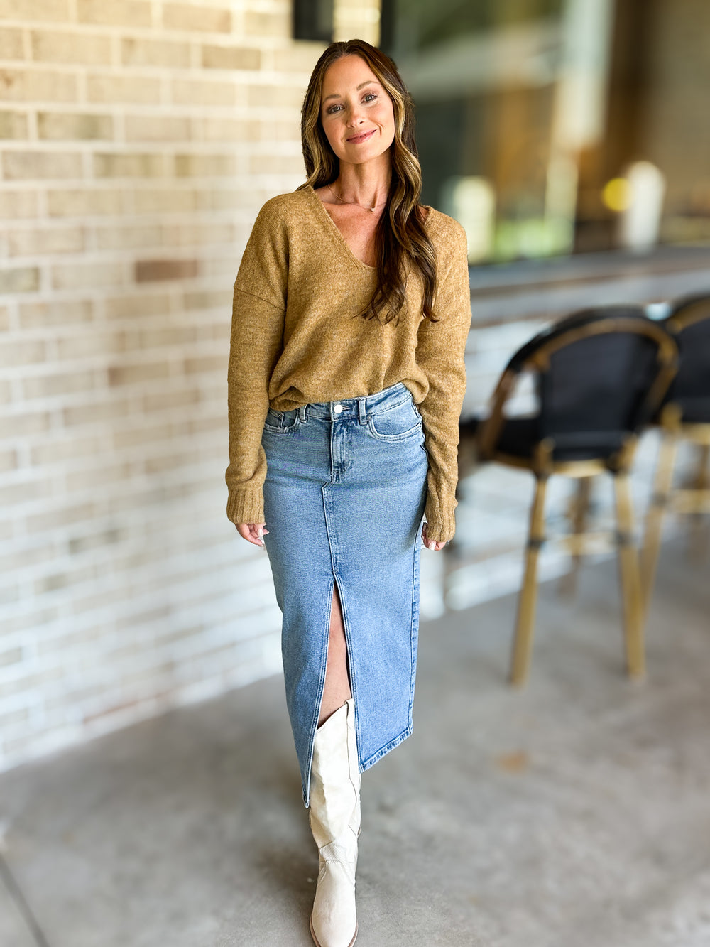 Sweater weather is real. For some every day is sweater weather. Whatever it is for you, this one is a great choice. Just a basic honey brown heathered knit, V-neck, long sleeve sweater that hits right around the waistline.