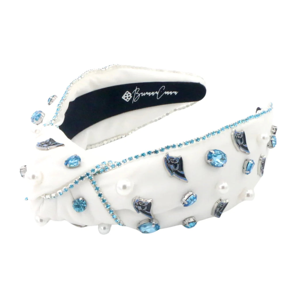 - White Neoprene Headband with Carolina Panthers Silver Plated Logo Charms, Hand-Sewn Resin Pearls and Blue Crystals, with a Blue Crystal Trim
